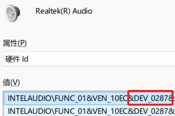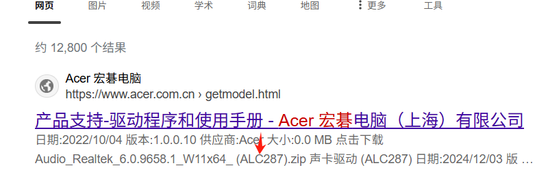 记住dev后面的数字,我这是0287,直接浏览器搜索ACL287(或者去声卡驱动官网搜ACL***,虽然我的没搜到),你的就是ACL***