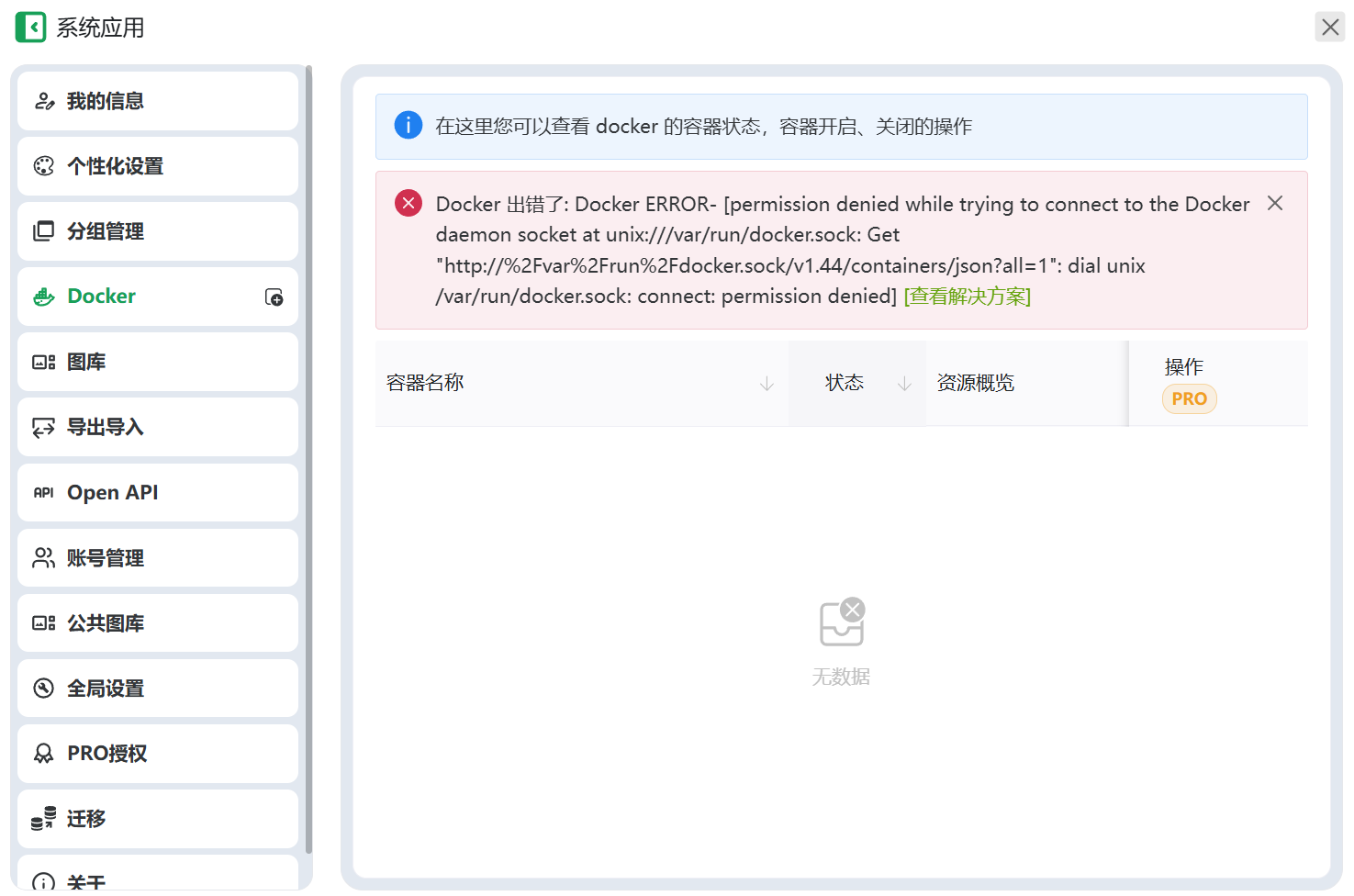 通过观察sunpanel的报错,可以看到是缺少了/var/run/docker.sock的权限