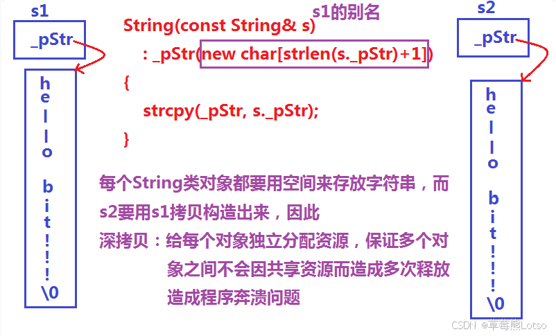 public:String(const char* str = ""){// 构造String类对象时,如果传递nullptr指针,可以认为程序非if (nullptr == str){assert(false);return;}_str = new char[strlen(str) + 1];strcpy(_str, str);}String(const String& s): _str(new char[strlen(s._str) + 1]){strcpy(_str, s._str);}String& operator=(const String& s){if (this != &s){char* pStr = new char[strlen(s._str) + 1];strcpy(pStr, s._str);delete[] _str;_str = pStr;}return *this;}~String(){if (_str){delete[] _str;_str = nullptr;}}
