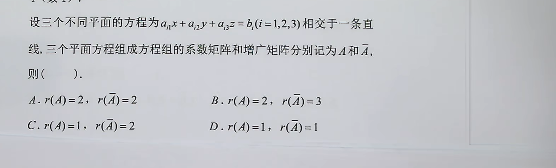 以该题作为分析,如果相交于一个直线那么只有可能是5即有两个平面重合,一个平面于这两相交构成了一个平面,即有两个有效约束,那么就是秩=2