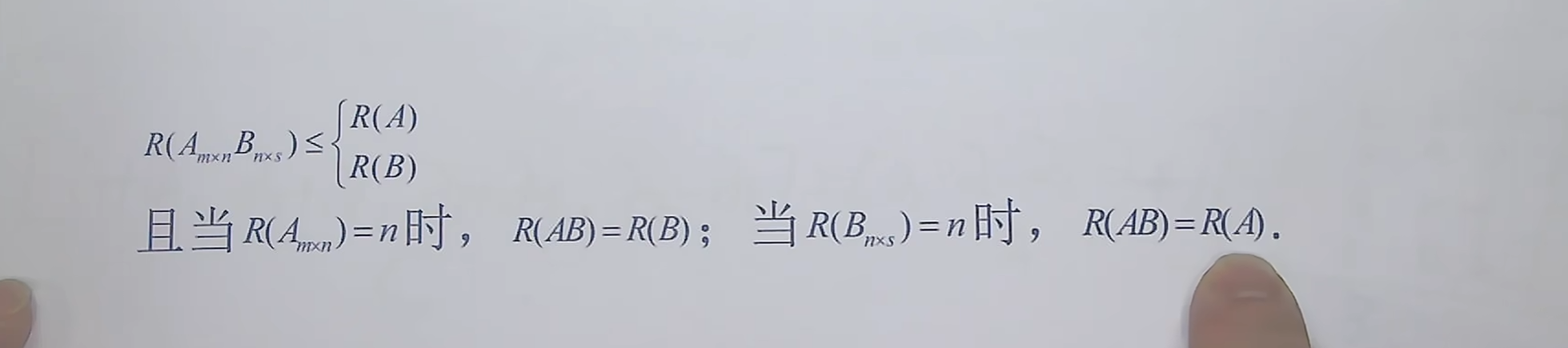 两个矩阵相乘,谁的秩=链接的n这个数字的大小,那么就不会改变原本矩阵的秩,即原本矩阵的秩一定为R(AB)=R(A) 或者 R(B)