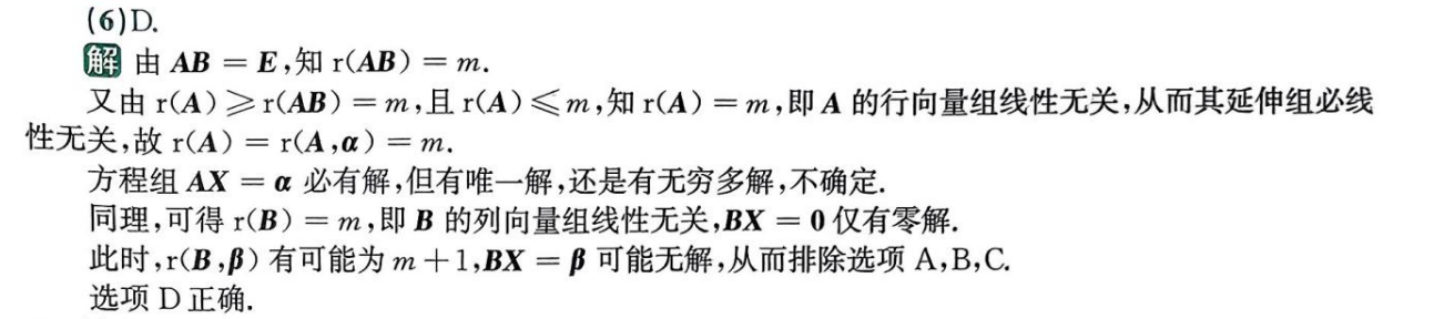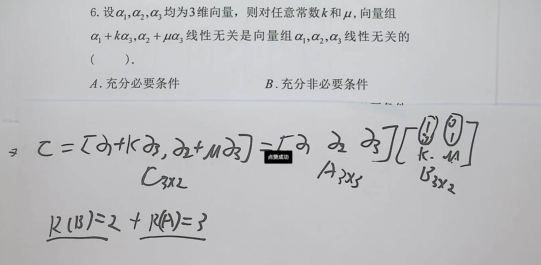A已知线性无关,则线性无关的向量组不会改变原本矩阵的秩,而原本矩阵的秩就等于R(B)=2故C线性无关