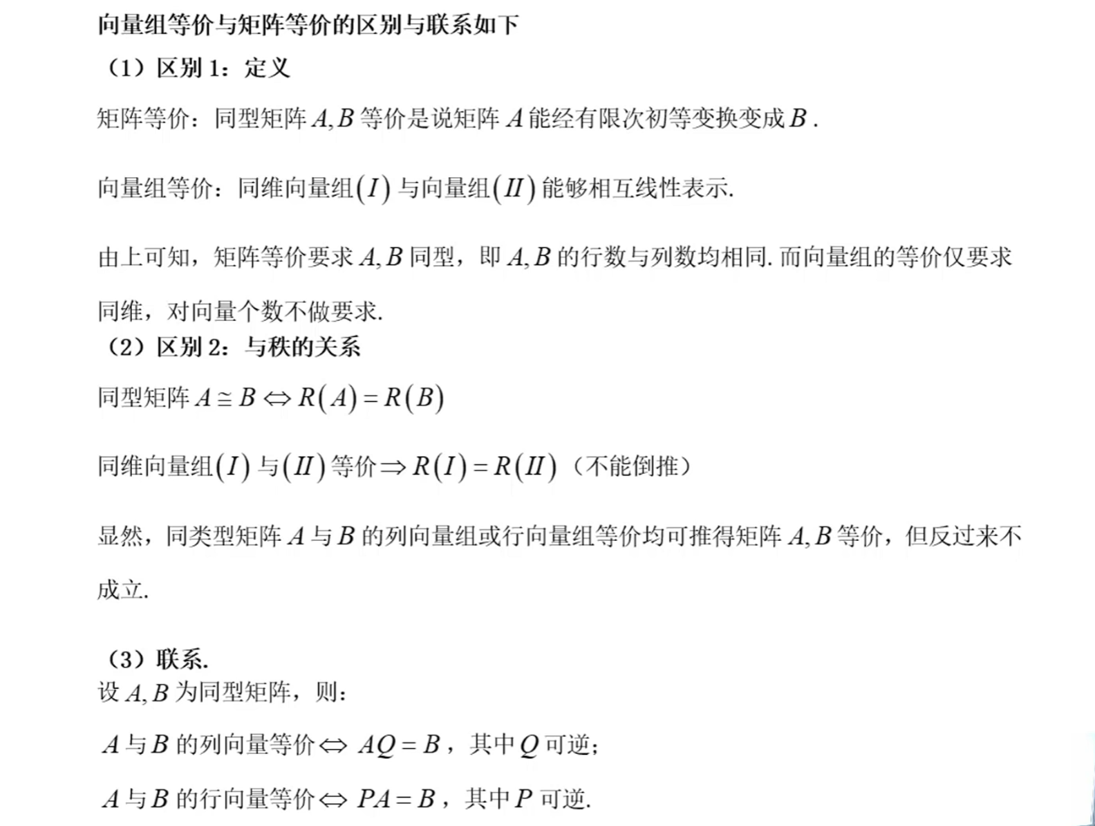 向量组等价和矩阵等价的区别和联系