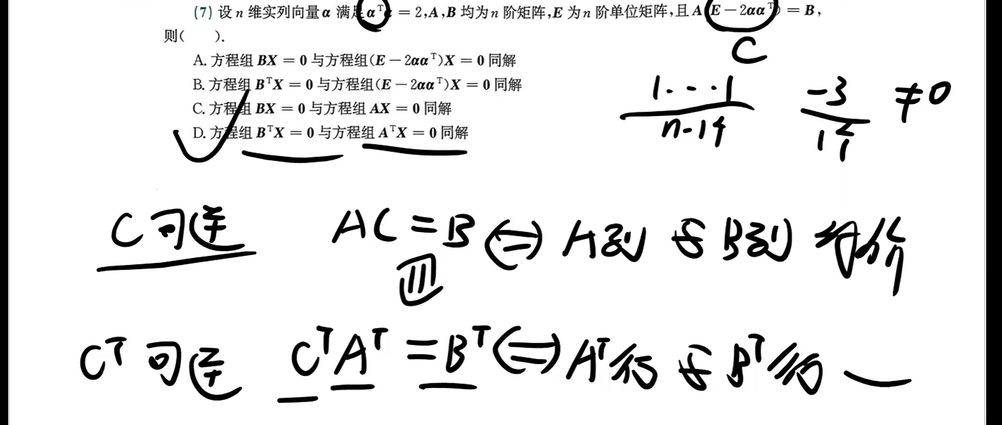 又因为C可逆,所以作用于A不会改变其A行向量间性质,又因为行向量等价,方程组等价,所以同解