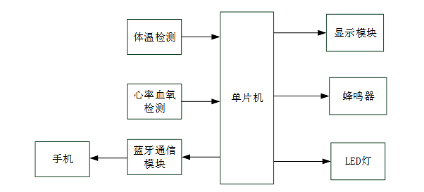 本次课题为基于单片机的人体心率、体温监测的研究,在此设计了如图2.1所示的系统结构框图,整个系统包括了MAX30102心率血氧检测模块、DS18B20体温检测模块、液晶显示模块、蓝牙通信模块,以及主控制器STM32单片机。其可以实现对体温、心率、血氧的参数检测,当出现异常时通过蜂鸣器和LED灯进行报警提示,并且可以将检测的数据通过蓝牙传输到手机APP,方便用户实现远程监控。