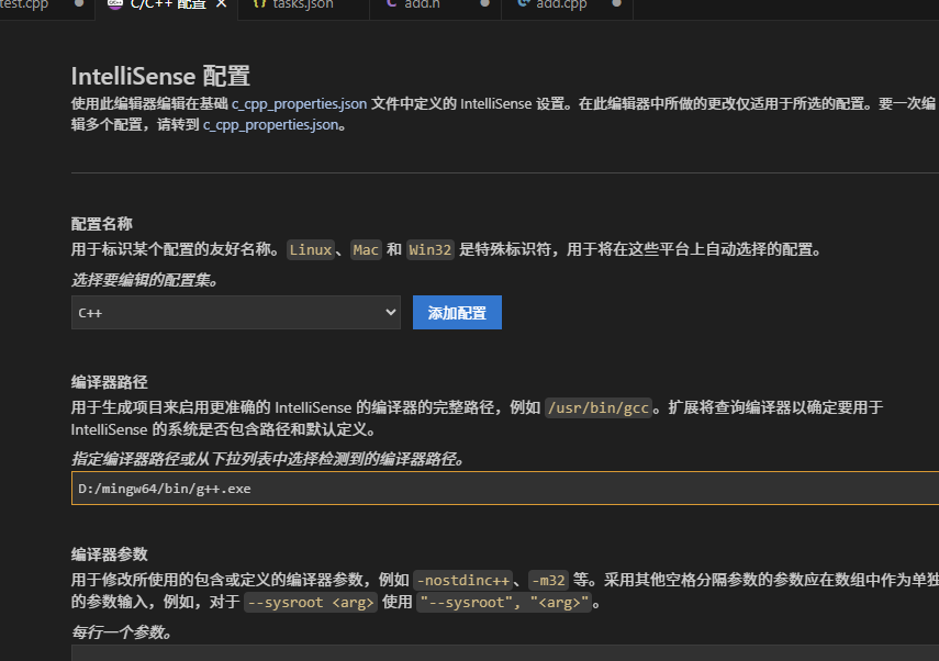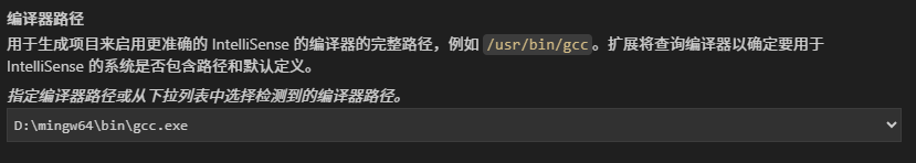 首先是配置编译器路径,安装好mingw64后在安装路径下找到bin中的gcc.exe编译器路径,赋值粘贴过去