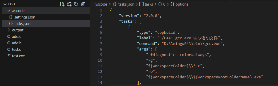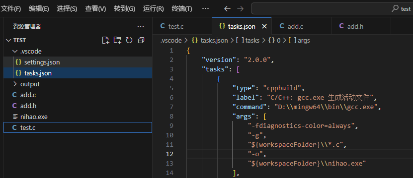 {"version": "2.0.0","tasks": [{"type": "cppbuild","label": "C/C++: gcc.exe 生成活动文件","command": "D:\\mingw64\\bin\\gcc.exe","args": ["-fdiagnostics-color=always","-g","${file}","-o","${fileDirname}\\${fileBasenameNoExtension}.exe"],"options": {"cwd": "${fileDirname}"},"problemMatcher": ["$gcc"],"group": "build","detail": "编译器: D:\\mingw64\\bin\\gcc.exe"}]