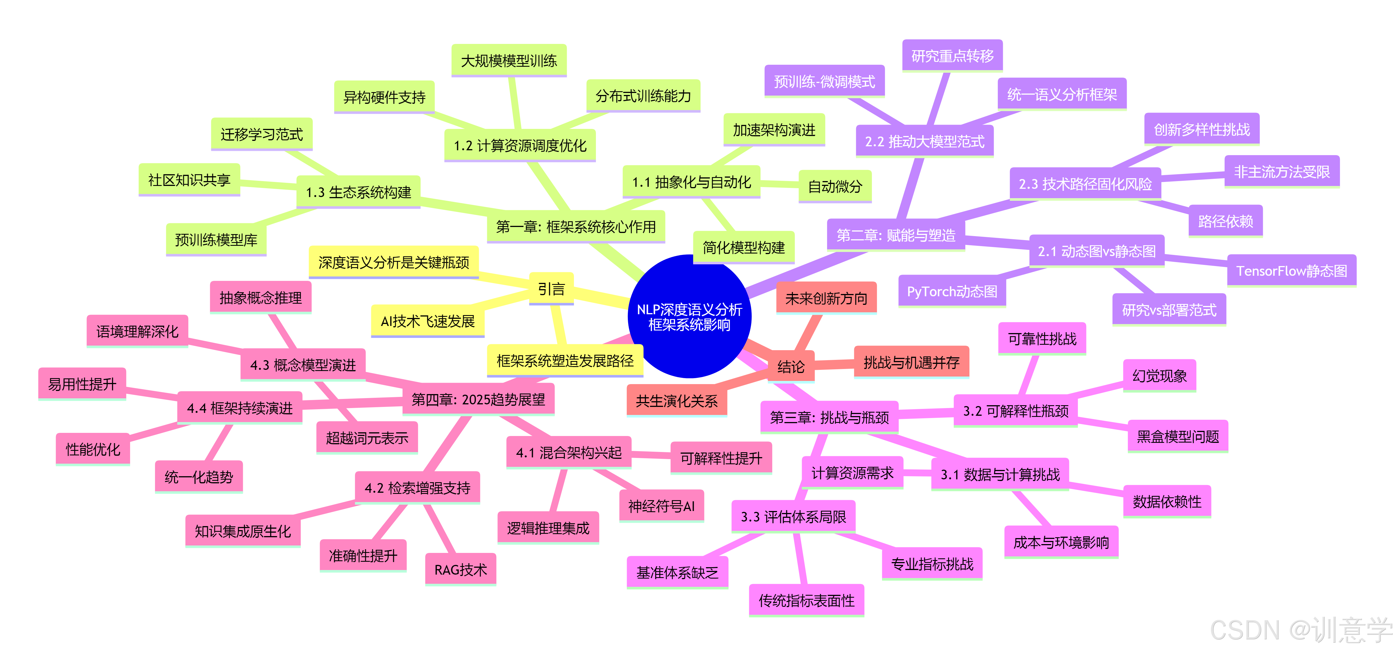 框架系统与NLP深度语义分析之间存在着一种共生演化的关系。框架通过提供强大的计算抽象和庞大的生态系统,极大地加速了深度学习模型(尤其是大规模预训练模型)的发展,并从根本上重塑了语义分析的研究范式。然而,它们也带来了对数据和算力的巨大依赖、模型“黑盒”问题以及评估体系滞后等一系列挑战。