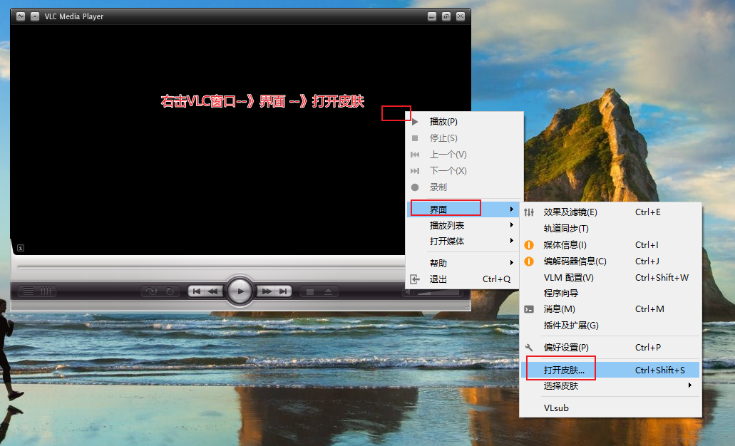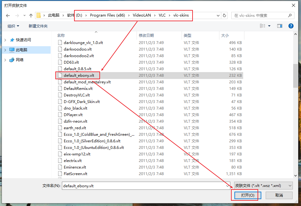 将vlc-skins.zip文件夹解压,然后,把vlc-skins拷贝到VLC的安装目录,比如:D:\Program Files (x86)\VideoLAN\VLC,双击vlc.exe,打开VLC播放器 --》右击VLC窗口 --》界面–》皮肤 --》自定义 --》进入vlc-skins文件夹,选中自己想要的.vlt文件即可。如图(1.1)、图(1.2)所示: