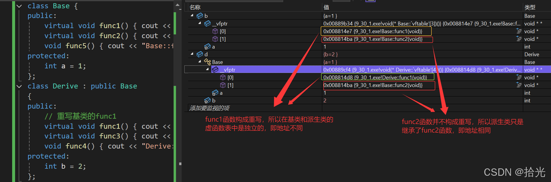 class Base { public:virtual void func1() { cout << "Base::func1" << endl; } }; class Derive : public Base { public:// 重写基类的func1virtual void func1() { cout << "Derive::func1" << endl; } };int main() {int i = 0;static int j = 1;int* p1 = new int;const char* p2 = "xxxxxxxx";printf("栈:%p\n", &i);printf("静态区:%p\n", &j);printf("堆:%p\n", p1);printf("常量区:%p\n", p2);Base b;Derive d;Base* p3 = &b;Derive* p4 = &d;printf("Person虚表地址:%p\n", *(int*)p3);printf("Student虚表地址:%p\n", *(int*)p4);printf("虚函数地址:%p\n", &Base::func1);printf("普通函数地址:%p\n", &Base::func5);return 0; }