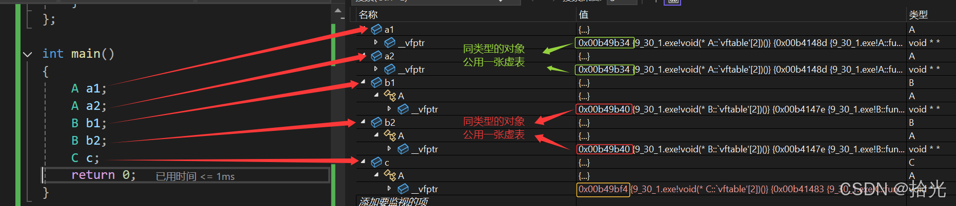 • 基类对象的虚函数表中存放基类所有虚函数的地址。同类型的对象共用同一张虚表,不同类型的对象各自有独立的虚表,所以基类和派生类有各自独立的虚表。