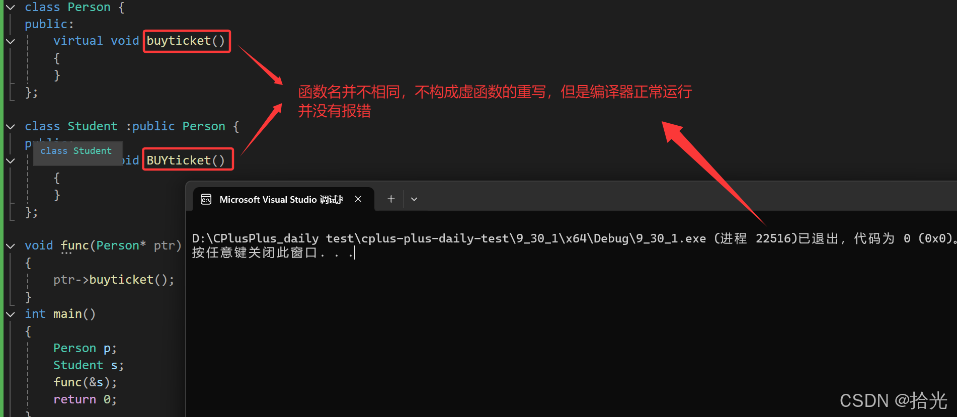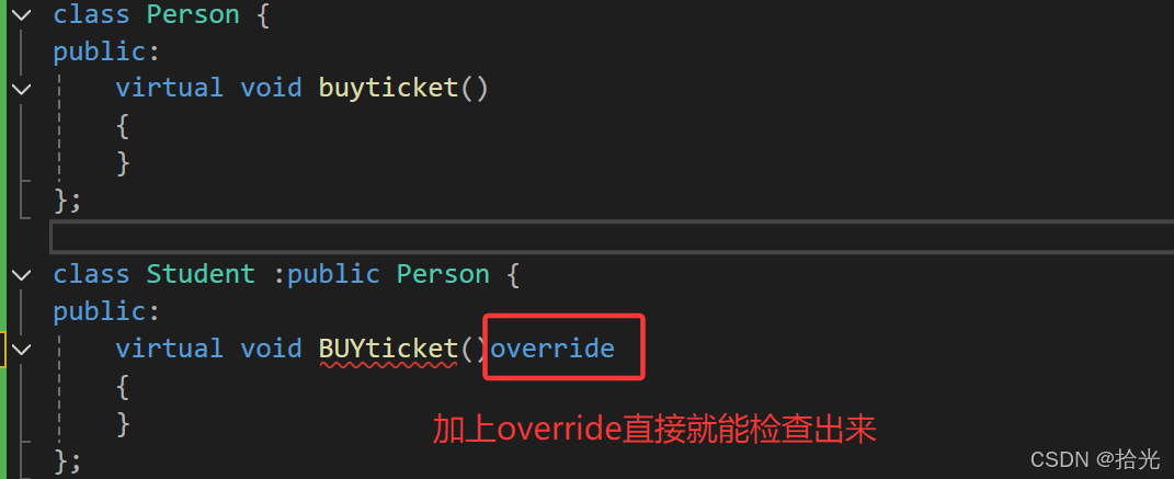 还需要注意一点:在重写基类虚函数时,派生类的虚函数在不加virtual关键字时,也可以构成重写(因为子类继承基类后,基类的虚函数被继承下来了,在派生类依旧保持虚函数属性),但是该种写法不是很规范,不建议这样 使用,不过在考试选择题中,经常会故意买这个坑,让你判断是否构成多态。