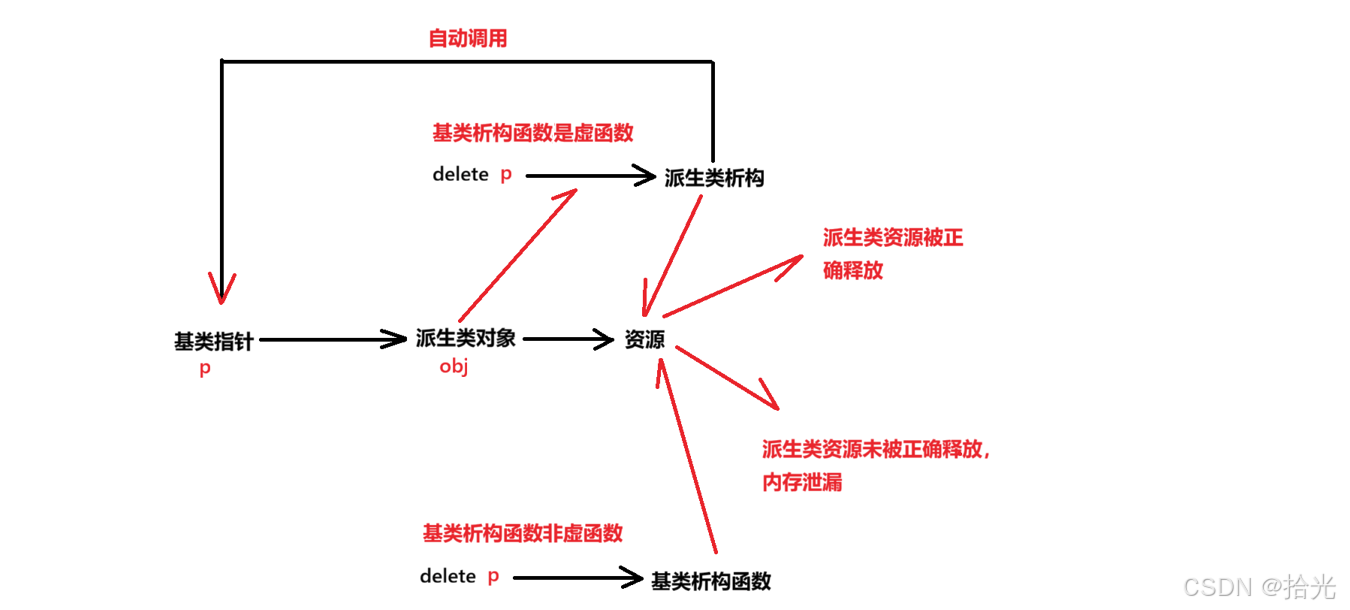 当一个基类的指针 ptr 指向派生类对象时,如果基类的析构函数不实现为虚函数,那么当delete ptr释放该对象时,由于静态绑定(ptr是什么类类型的指针就调用哪个类的析构函数),就只调用基类的析构函数,如果派生类对象中有额外的资源,这时候就会导致内存泄漏。所以,C++中只要基类的析构函数实现为虚函数,无论派生类析构函数加不加virtual关键字,都会与基类的析构函数构成重写,即此时满足多态,编译器会根据ptr指针真正指向的类类型对象来调用相应的析构函数(动态绑定),而在前面的继承中已经讲到:子类的析构函数会自动调用基类的析构函数,所以,此时即使基类中有资源,也会被释放。