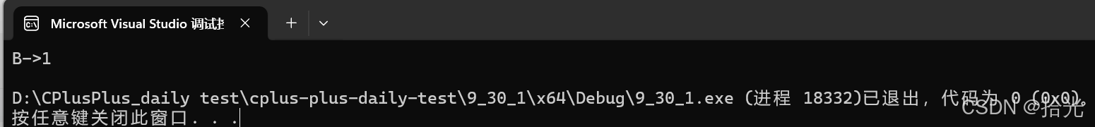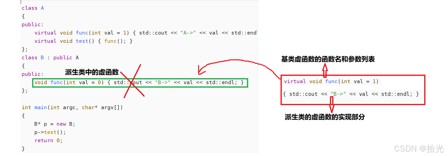 class A { public:virtual void func(int val = 1) { std::cout << "A->" << val << std::endl; }virtual void test() { func(); } }; class B : public A { public:void func(int val = 0) { std::cout << "B->" << val << std::endl; } };int main(int argc, char* argv[]) {B* p = new B;p->test();return 0; }