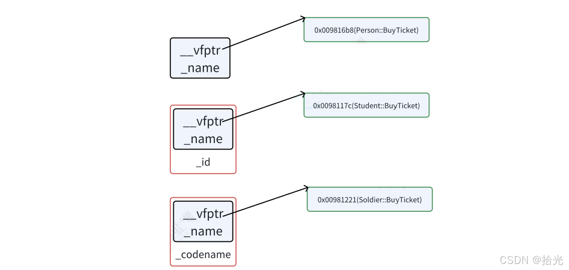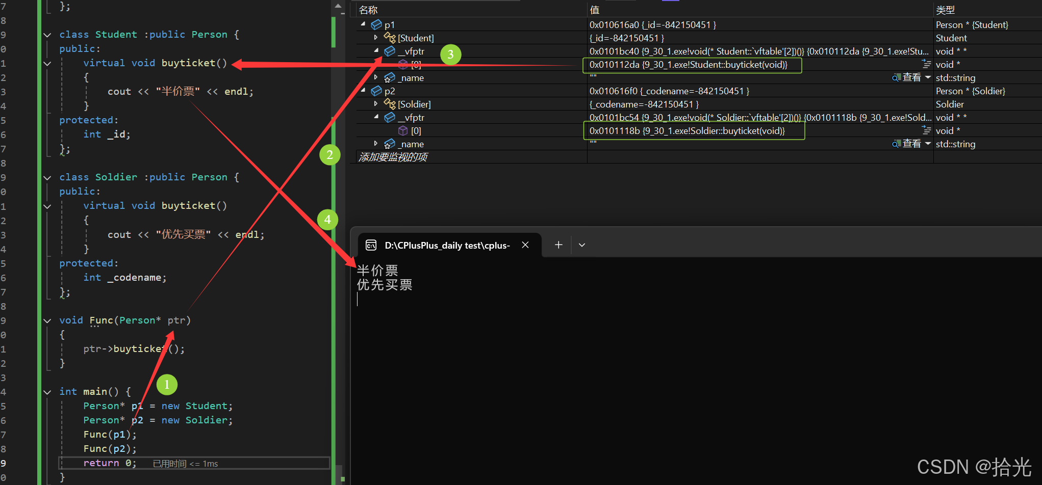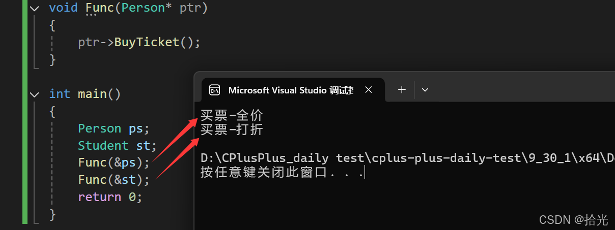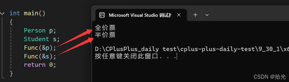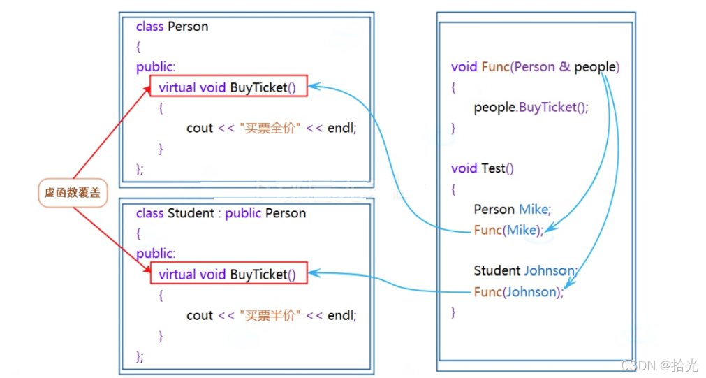 {Person p; // 基类对象Student s; // 派生类对象Func(&p); // 将基类对象作为实参,则调用基类的虚函数Func(&s); // 将派生类对象作为实参,则调用派生类的虚函数return 0;