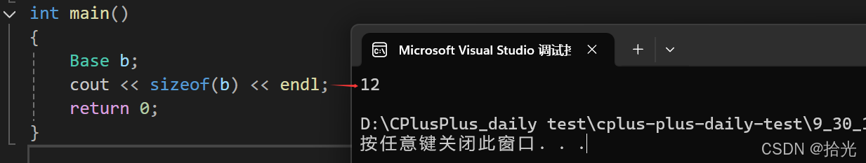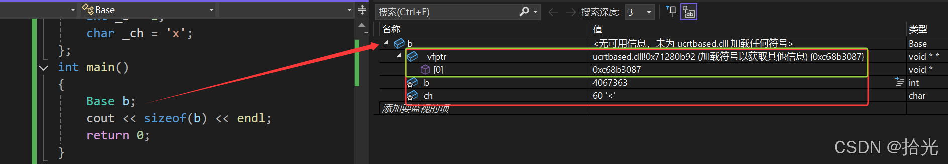 class Base { public:virtual void Func1(){cout << "Func1()" << endl;} protected:int _b = 1;char _ch = 'x'; };int main() {Base b;cout << sizeof(b) << endl; // 计算b对象的大小return 0; }