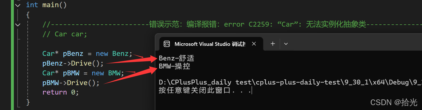 {//-----------------错误示范:编译报错:error C2259: “Car”: 无法实例化抽象类-------------// Car car;Car* pBenz = new Benz;pBenz->Drive();Car* pBMW = new BMW;pBMW->Drive();return 0;