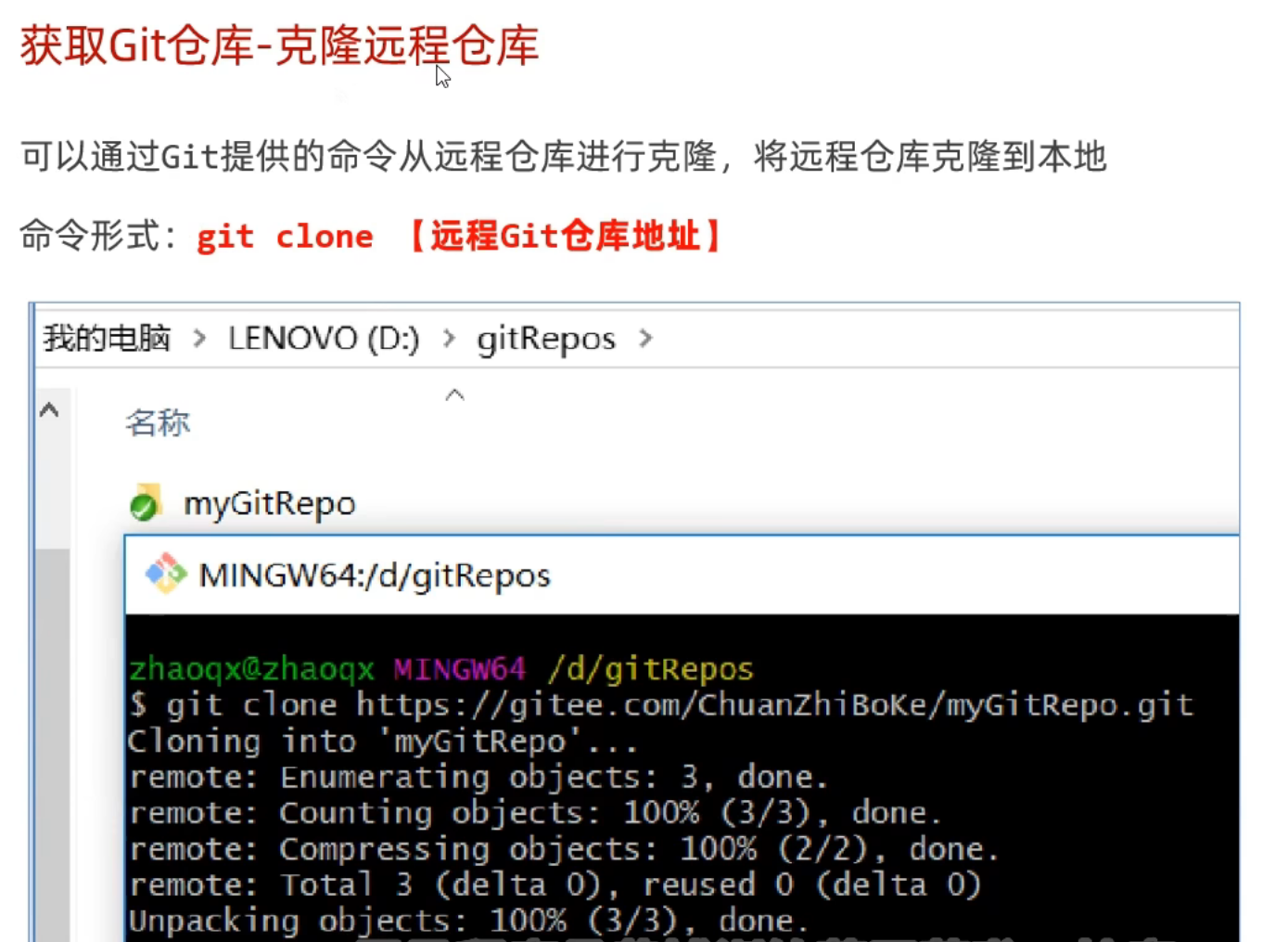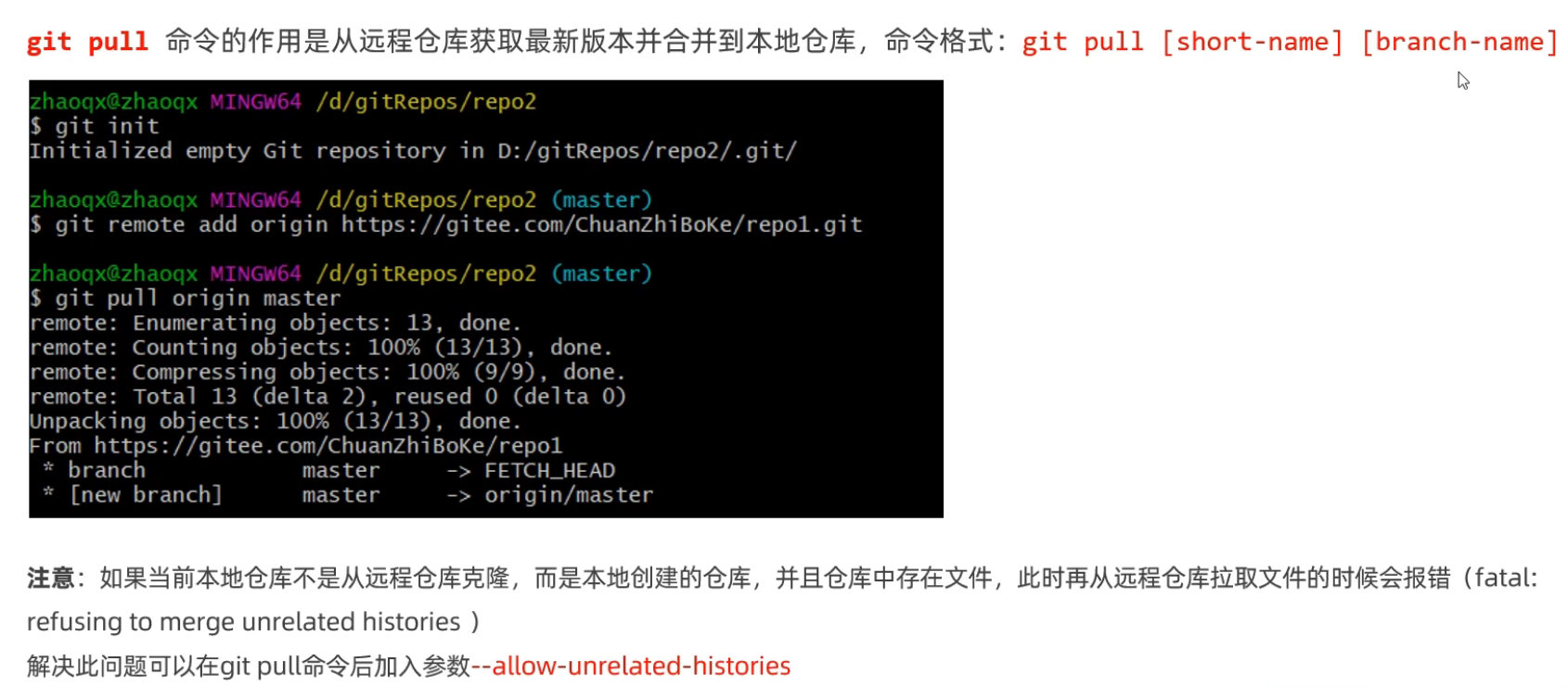 pull:拉取,将远程仓库文件和版本信息下载到本地仓库