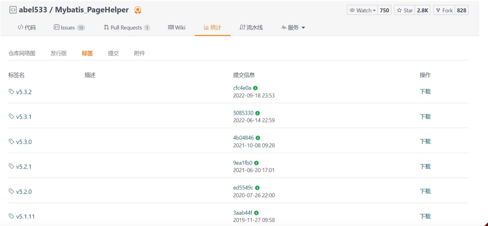 Git 中的标签,指的是某个分支某个特定时间点的状态。通过标签,可以很方便的切换到标记时的状态。比较有代表性的是人们会使用这个功能来标记发布节点(v1.0,v1.2等)。下面是PageHelper 标签: