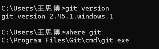 安装完成后我们 cmd 进入命令行工具,输入git version即可查看 git 的版本,输入 where git 即可查看git的路径