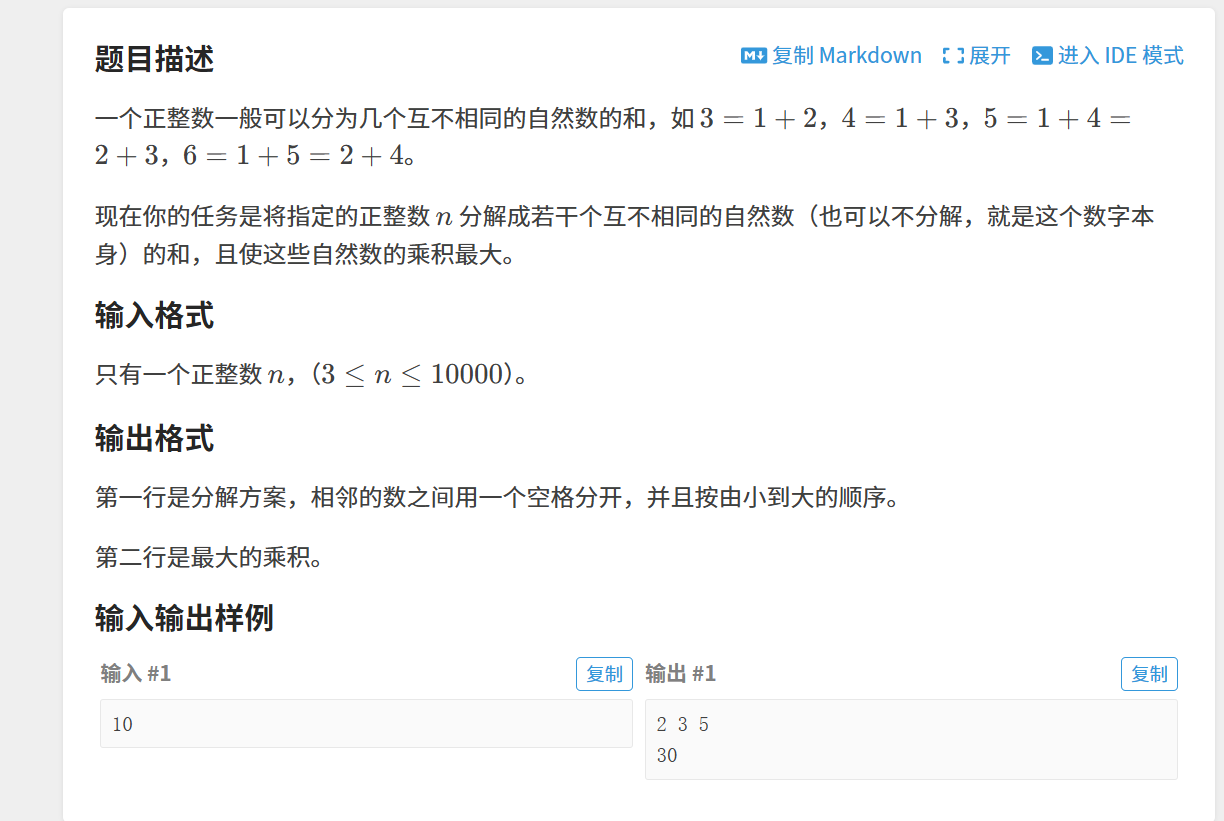 {ios::sync_with_stdio(false);cin.tie(nullptr);int n;if (!(cin >> n)) return 0;auto res = maxProductFactors(n);auto& factors = res.second;for (size_t i = 0; i < factors.size(); ++i) {cout << factors[i] << (i + 1 == factors.size() ? '\n' : ' ');}cout << res.first << '\n';return 0;