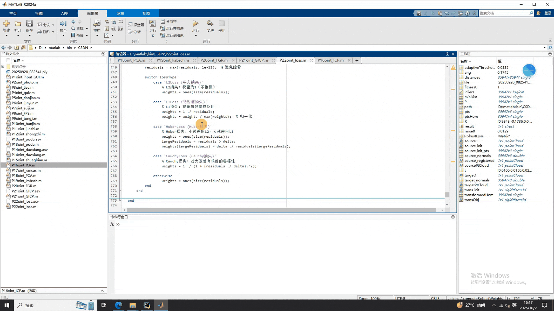 %% =========================================================================function weights = computeRobustWeights(residuals, lossType, delta)% 计算不同鲁棒损失函数的权重residuals = max(residuals, 1e-12); % 避免除零switch lossTypecase 'L2Loss (平方损失)'% L2损失:权重为1(不鲁棒)weights = ones(size(residuals));case 'L1Loss (绝对值损失)'% L1损失:权重与残差成反比weights = 1 ./ residuals;weights = weights / max(weights); % 归一化case 'HuberLoss (Huber损失)'% Huber损失:小残差用L2,大残差用L1weights = ones(size(residuals));largeResiduals = residuals > delta;weights(largeResiduals) = delta ./ residuals(largeResiduals);case 'CauchyLoss (Cauchy损失)'% Cauchy损失:对大残差有很好的鲁棒性weights = 1 ./ (1 + (residuals ./ delta).^2);otherwiseweights = ones(size(residuals));endendend