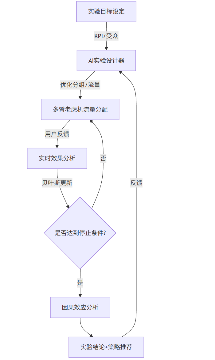 graph TD A[实验目标设定] -->|KPI/受众| B[AI实验设计器] B -->|优化分组/流量| C[多臂老虎机流量分配] C -->|用户反馈| D[实时效果分析] D -->|贝叶斯更新| E{是否达到停止条件?} E -->|是| F[因果效应分析] E -->|否| C F --> G[实验结论+策略推荐] G -->|反馈| B
