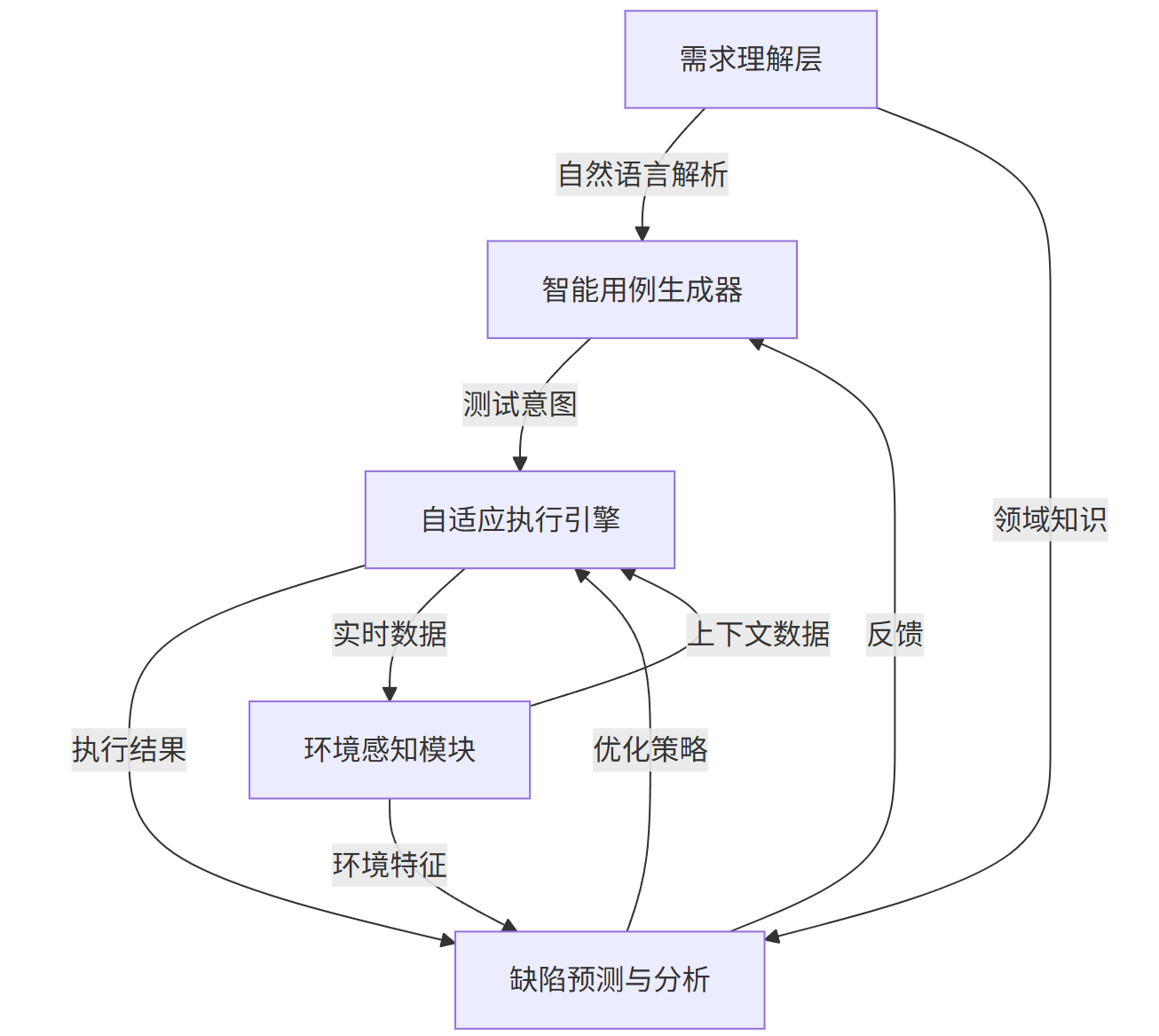 graph TD A[需求理解层] -->|自然语言解析| B[智能用例生成器] B -->|测试意图| C[自适应执行引擎] D[环境感知模块] -->|上下文数据| C C -->|执行结果| E[缺陷预测与分析] E -->|反馈| B D -->|环境特征| E A -->|领域知识| E C -->|实时数据| D E -->|优化策略| C