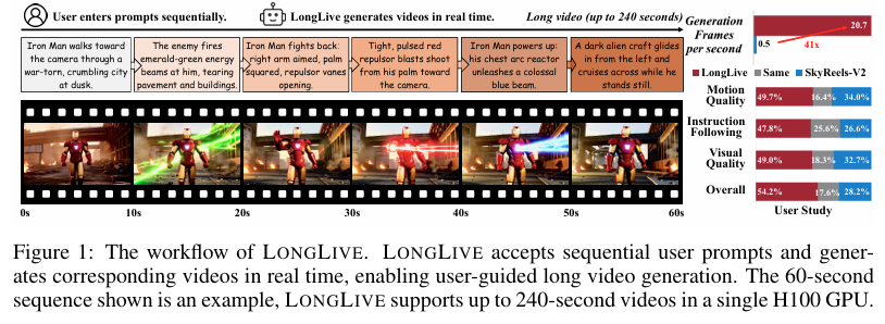 在单个NVIDIA H100 GPU上,LONG LIVE能够持续以20.7 FPS的速度生成视频,支持最长240秒的视频生成,展现了高效的长视频生成能力。