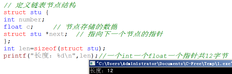也就是说,在结构体内要定义一个指针,指针要指向下一个结构体,从而形成链表形式。一个结构体的长度确定了,就是链表一节的长度。此例为12字节。
