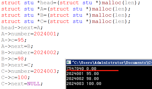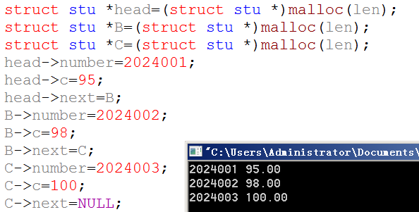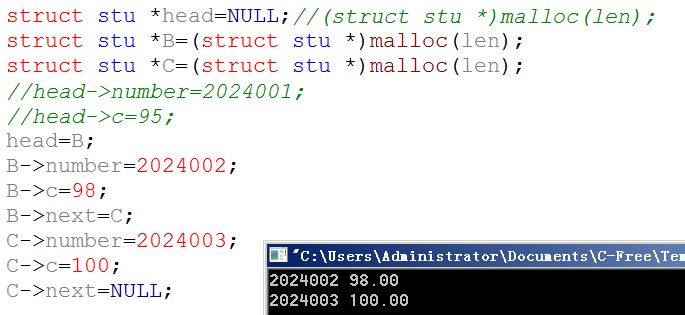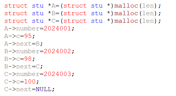 声明A、B、C三个结构体指针,分配三节内存(每节12字节),写入数据,通过指针传递实行首尾相连,最后一个指向NULL。