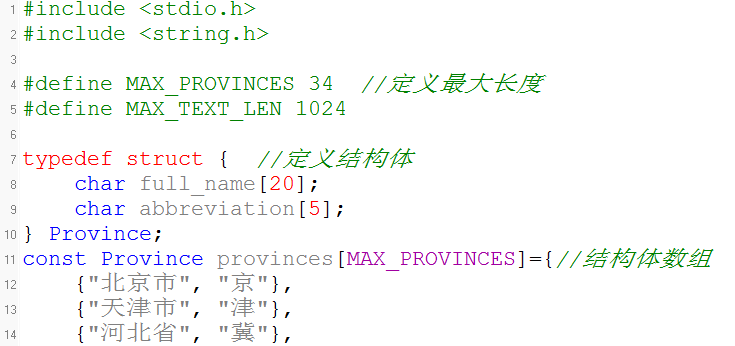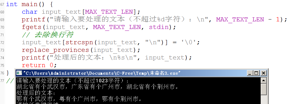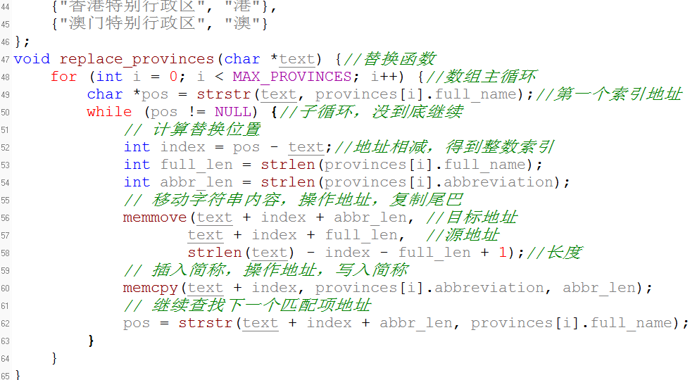 { {"北京市", "京"}, {"天津市", "津"},....},然后到文本中查找“北京市”,找到替换,再找,直到找不到为止;再开始“天津市”...直到全部完成。关于在一段文本查找字符串,我们学过:字符串截取strncpy(a,b+索引,长度)、字符串比较strcmp(a,b)两个函数,可以在文本中从头到尾(不能跳)截串比较。还有更好的函数strstr(a,b),返回b在a中索引。