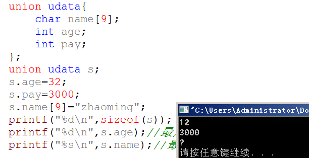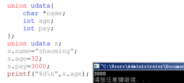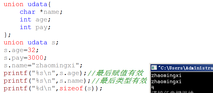 关键字union不可少,可声明多个成员,最后一次成员赋值被保存,有效。