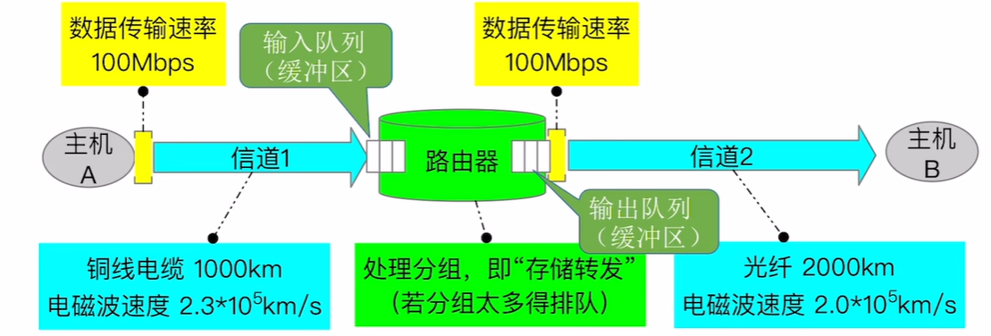 - 传播时延 = 信道长度(m)/ 电磁波在信道中的传播速度(m/s),电磁波在信道中传播一定距离所花的时间