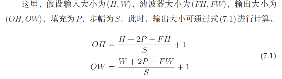 输出数据的大小可以通过输入大小、滤波器大小、步幅、填充等计算,公式如下:
