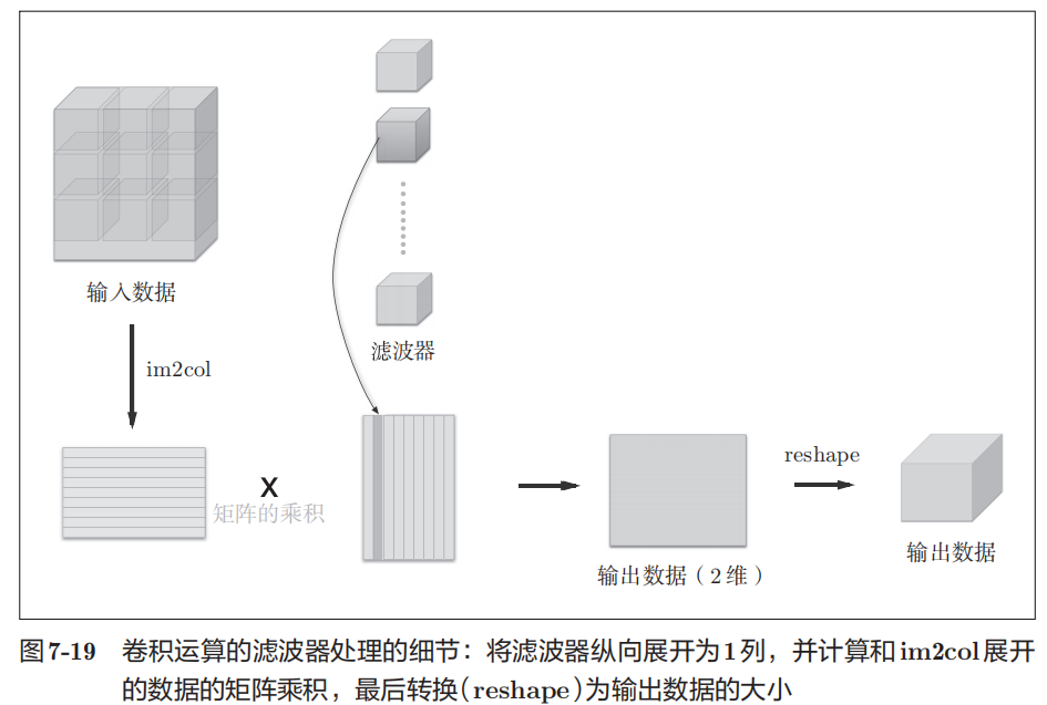 将输入数据通过im2col转换为2维矩阵,将滤波器reshape为二维,进行矩阵相乘,最后reshape得到输出数据,实现卷积层