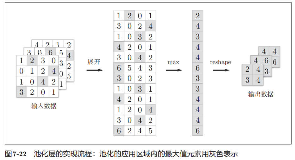 将输入数据通过im2col转换为2维矩阵,每一行取最大值,最后reshape得到输出数据,实现池化层