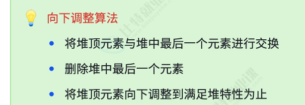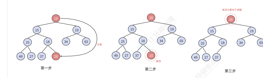 删除堆是删除堆顶的数据,将堆顶的数据根最后⼀个数据⼀换,然后删除数组最后⼀个数据,再进⾏ 向下调整算法。