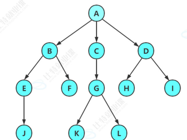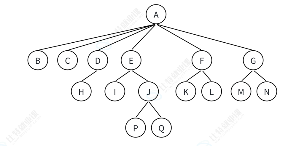 节点的度:节点拥有的子树个数(如A的度为6,B的度为0)