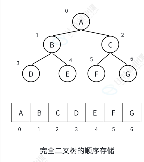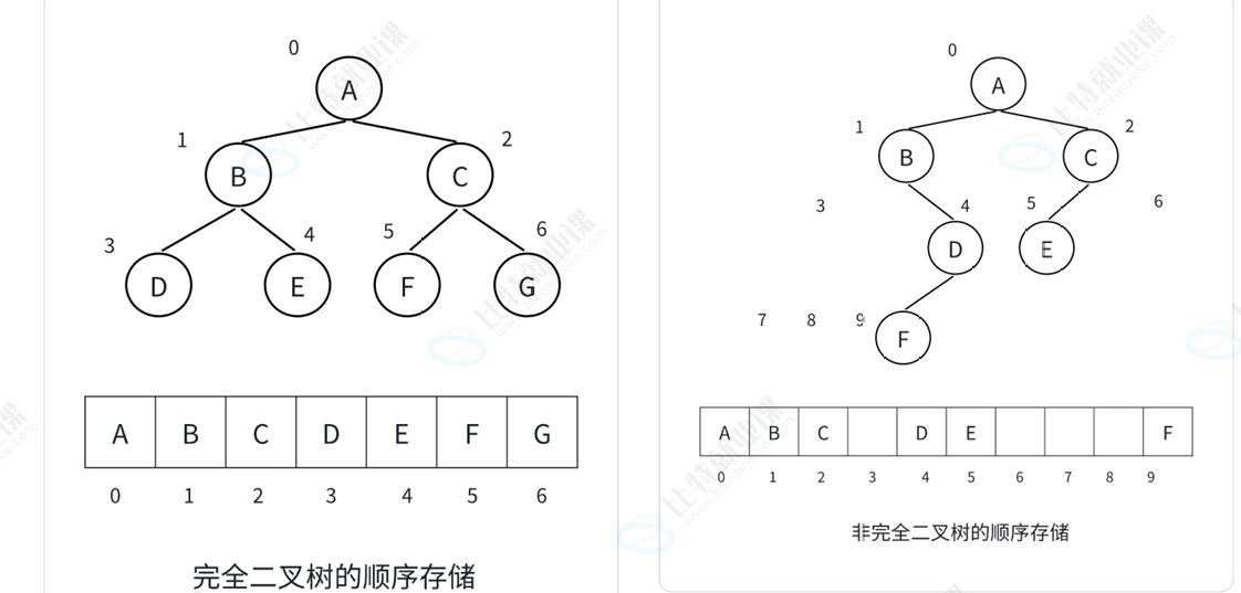 顺序结构存储就是使⽤数组来存储,⼀般使用数组只适合表示完全⼆叉树,因为不是完全⼆叉树会有 空间的浪费,完全⼆叉树更适合使⽤顺序结构存储