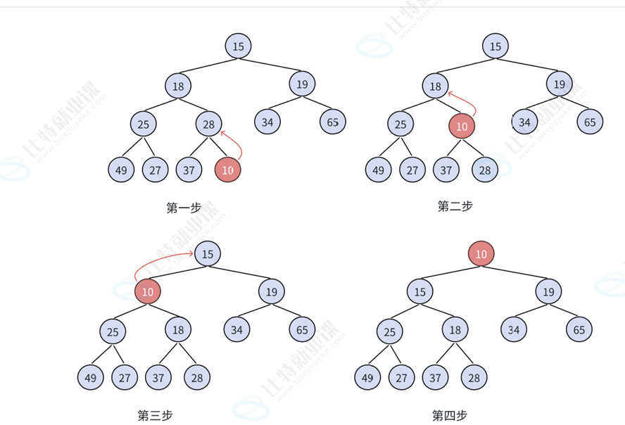 void AdjustUp(HPDataType* data, int child) {int parent = (child - 1) / 2;while (child > 0) {// 大堆:data[child] > data[parent]// 小堆:data[child] < data[parent]if (data[child] > data[parent]) {// 交换父子节点HPDataType temp = data[child];data[child] = data[parent];data[parent] = temp;// 向上继续调整child = parent;parent = (child - 1) / 2;} else {break;}}