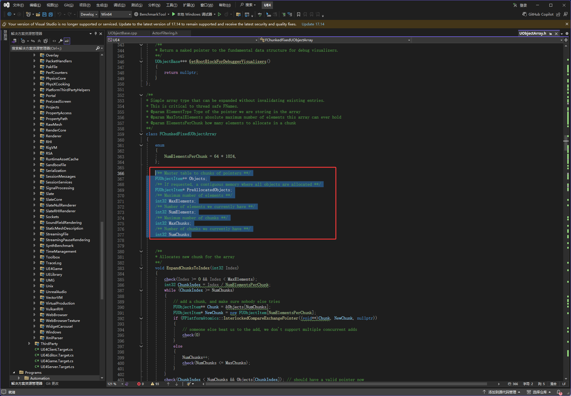 代码说明,里面的元素概念指的是FUObjectItem,然后FUObjectItem存放的是UObject,然后UObject指的是角色、武器、道具、组件等游戏中的东西,然后块的概念是可以存放多少个FUObjectItem