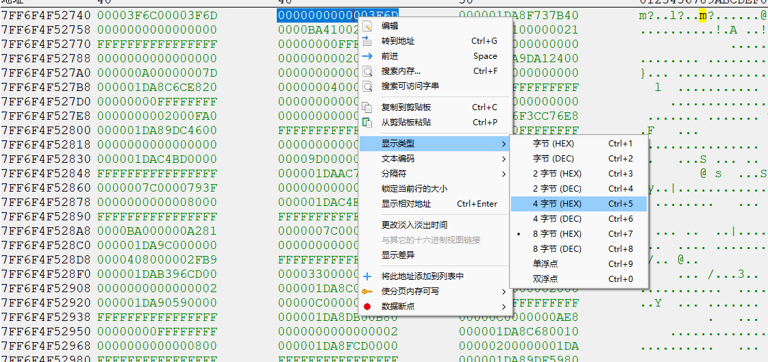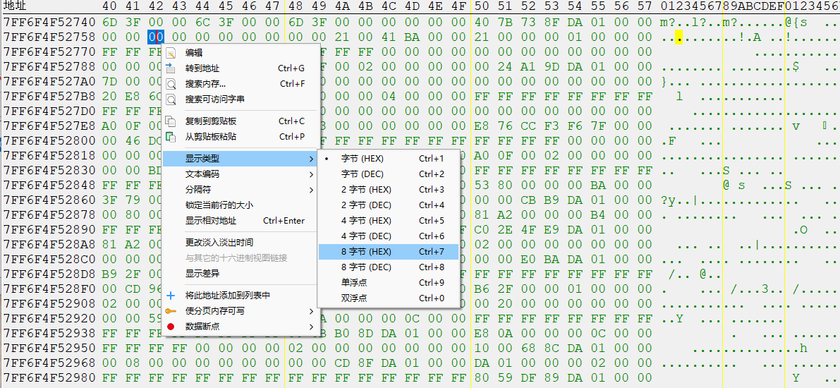 然后选择以8字节十六进制显示