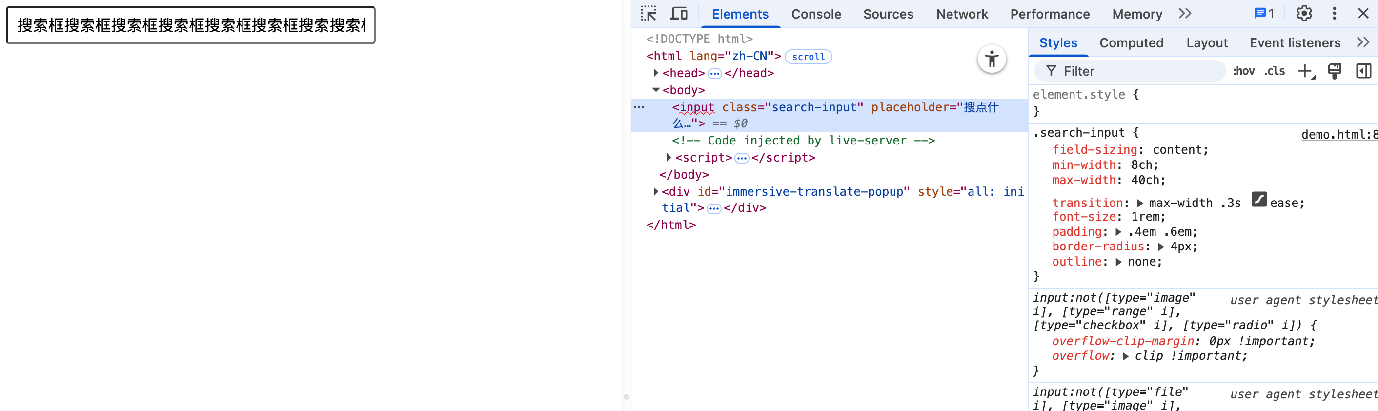 <head><meta charset="UTF-8"><title>搜索框示范</title><style>/* 核心样式:让搜索框随内容变宽 */.search-input {field-sizing: content; /* 宽度 = 内容长度 */min-width: 8ch;max-width: 40ch;transition: max-width .3s ease;font-size: 1rem;padding: .4em .6em;border-radius: 4px;outline: none;}.search-input:focus {max-width: 60ch;}body {height: 100vh;}</style>