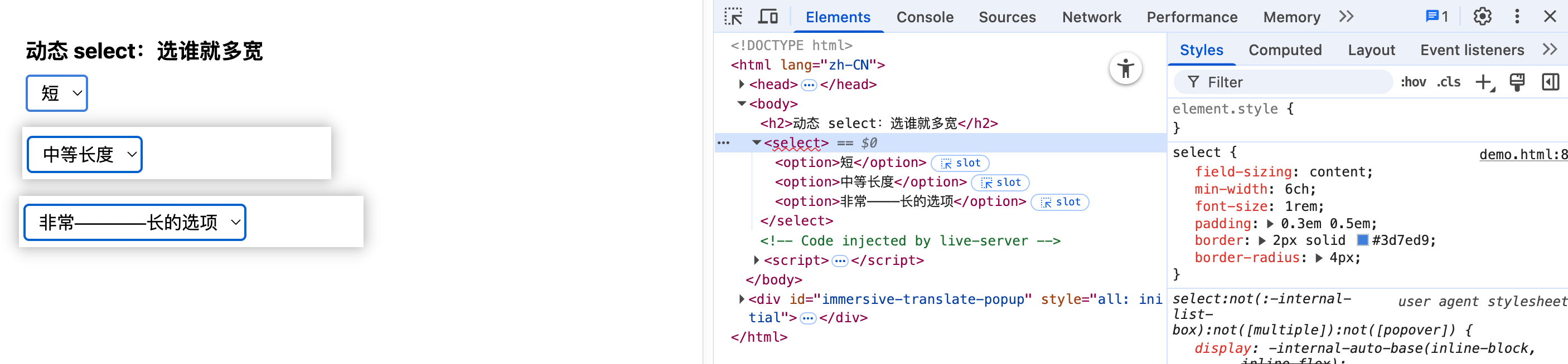 <html lang="zh-CN"><head><meta charset="UTF-8" /><title>field-sizing</title><style>/* === select 随选中项变宽 === */select {field-sizing: content; /* 宽度 = 当前选中项长度 */min-width: 6ch; /* 空态保底 */font-size: 1rem;padding: 0.3em 0.5em;border: 2px solid #3d7ed9;border-radius: 4px;}body {margin: 2rem;font-family: system-ui;}h2 {font-size: 1.2rem;margin-bottom: 0.5rem;}</style></head><body><h2>动态 select:选谁就多宽</h2><select><option>短</option><option>中等长度</option><option>非常————长的选项</option></select></body>