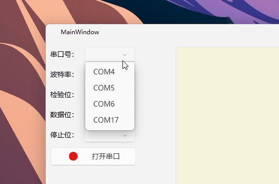 {/// <summary>/// Interaction logic for MainWindow.xaml/// </summary>public partial class MainWindow : Window{public string[] PortNames;public const int WM_DEVICECHANGE = 0x219; //设备改变消息编号public const int DBT_DEVICEARRIVAL = 0x8000; //设备插入消息编号public const int DBT_DEVICEREMOVECOMPLETE = 0x8004; //设备移除完成消息编号private SerialPort serialPort;public MainWindow(){InitializeComponent();}/// <summary>/// 主窗体加载事件/// </summary>/// <param name="sender"></param>/// <param name="e"></param>private void Window_Loaded(object sender, RoutedEventArgs e){HwndSource? hwndSource = PresentationSource.FromVisual(this) as HwndSource;if (hwndSource != null){hwndSource.AddHook(new HwndSourceHook(WindowEventHandler));PortNames = SerialPort.GetPortNames();UpdateSerialPort(PortNames);}}/// <summary>/// 串口插拔检测/// </summary>/// <param name="hwnd"></param>/// <param name="msg"></param>/// <param name="wParam"></param>/// <param name="lParam"></param>/// <param name="handled"></param>/// <returns></returns>private IntPtr WindowEventHandler(IntPtr hwnd, int msg, IntPtr wParam, IntPtr lParam, ref bool handled){if (msg == WM_DEVICECHANGE){switch (wParam.ToInt32()){case DBT_DEVICEARRIVAL://设备插入 PortNames = SerialPort.GetPortNames();Debug.WriteLine("有串口插入!");UpdateSerialPort(PortNames);break;case DBT_DEVICEREMOVECOMPLETE: //设备拔出完成PortNames = SerialPort.GetPortNames();Debug.WriteLine("有串口拔出!");UpdateSerialPort(PortNames);break;default:break;}}return IntPtr.Zero;}/// <summary>/// 串口列表更新/// </summary>/// <param name="PortNames"></param>public void UpdateSerialPort(string[] PortNames){CMBPort.Items.Clear();for (int i = 0; i < PortNames.Length; i++){CMBPort.Items.Add(PortNames[i]);}}}