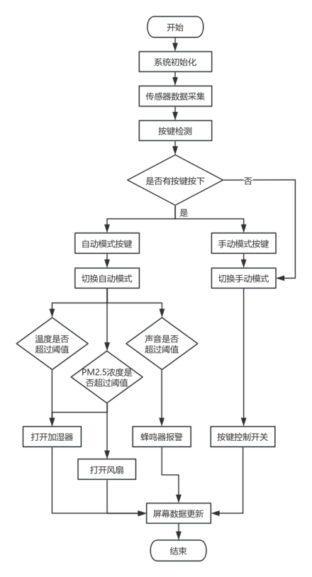 - 自动模式:检测到PM2.5粉尘浓度超过阈值,自动开启风扇和加湿器;检测到噪声模拟值超过阈值,自动开启蜂鸣器报警;当环境温度过高自动开启加湿器。