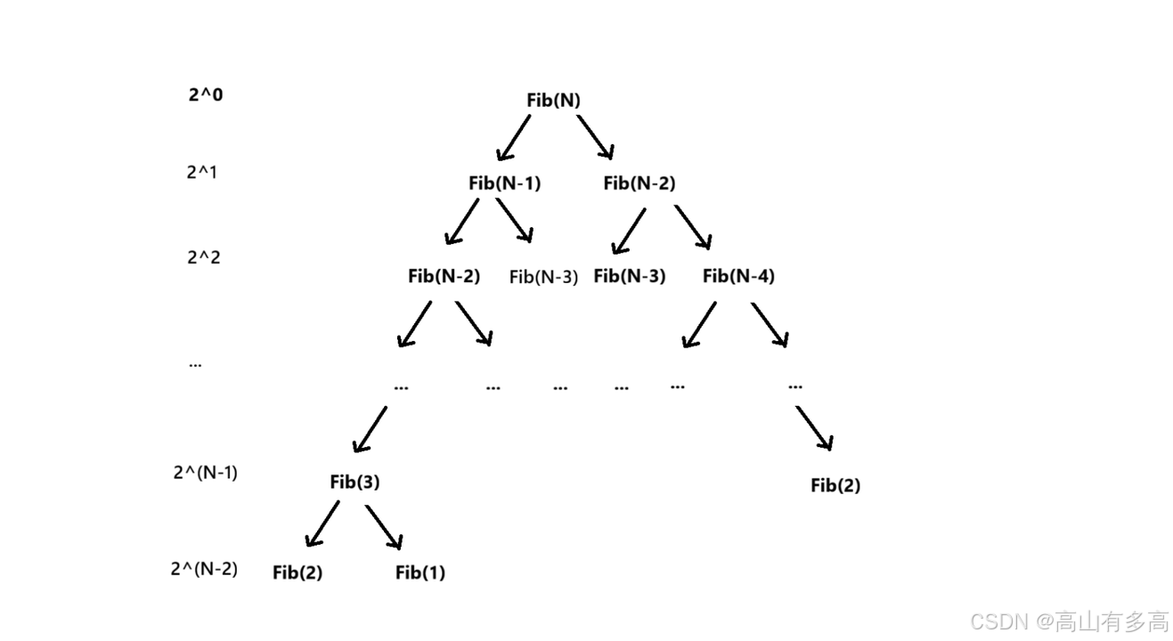 这种 “分支式递归” 会形成一棵递归树,每个节点Fib(N)(k ≥ 3)都会产生两个子节点Fib(N-1)和Fib(N-2),直到触达Fib(2) 和 Fib(1)。