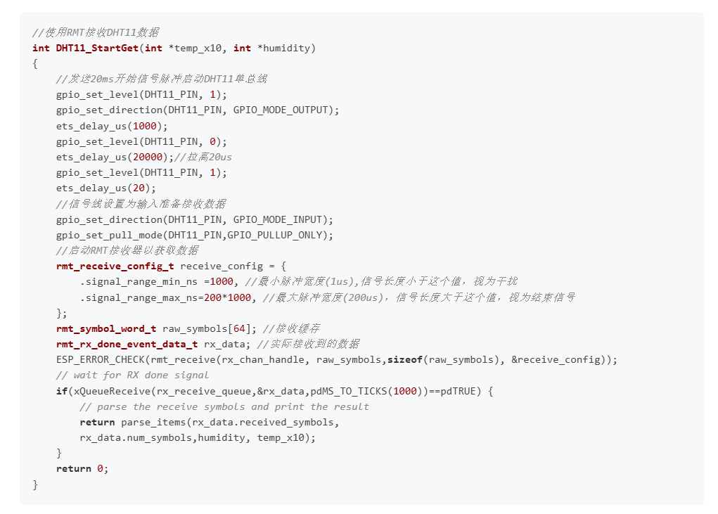 大致流程就是,主机发起开始信号(>18ms的低电平),拉高40us等待。然后DHT11会拉低80us表示响应信号,然后拉高80us表示开始传输数据。每一位数据前都有50us的低电平,紧接着如果是数据0,高电平持续时间大概在23-27us,如果是数据1,高电平大概是68us-74us,全部数据传输完成后,DHT11拉低50us,表示传输完毕,然后主机拉高表示通信结束。通过梳理这些时序,我们发现使用ESP32的RMT模块是可以拿来驱动DHT11的,不过这次我们要用到的是RMT模块的接收。具体代码请看下节。