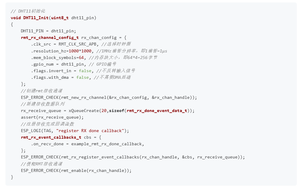 初始化中,首先是需要定义rmt_rx_channel_config_t内容,大致就是选择时钟源、时钟分辨率、底层内存块大小(一般设置为64)、GPIO编号等内容,时钟频率这里设定为1M,刚好是1us,因此低于1us的脉冲无法分辨。而DHT11时序中没有低于10us的脉冲,因此绰绰有余。